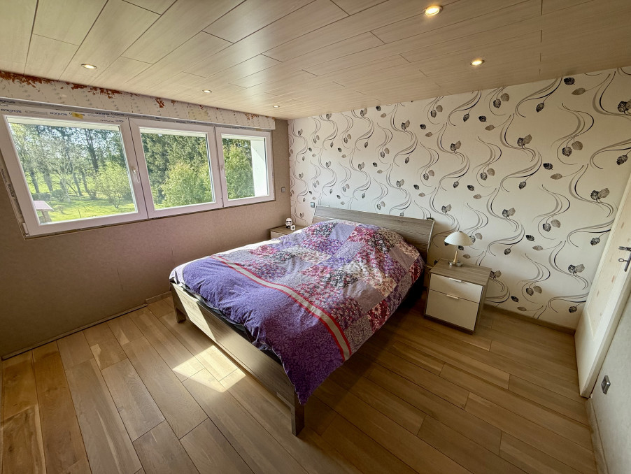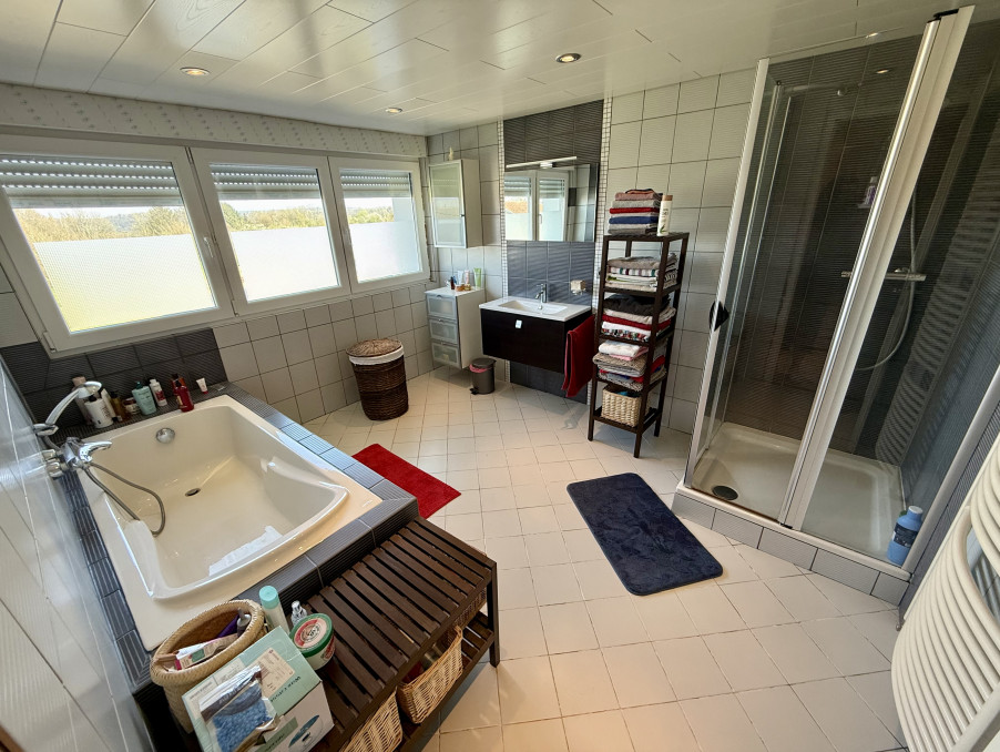 À l’étage : trois chambres lumineuses, un WC, une salle de bains avec douche, baignoire et vasque, ainsi qu’un grenier.